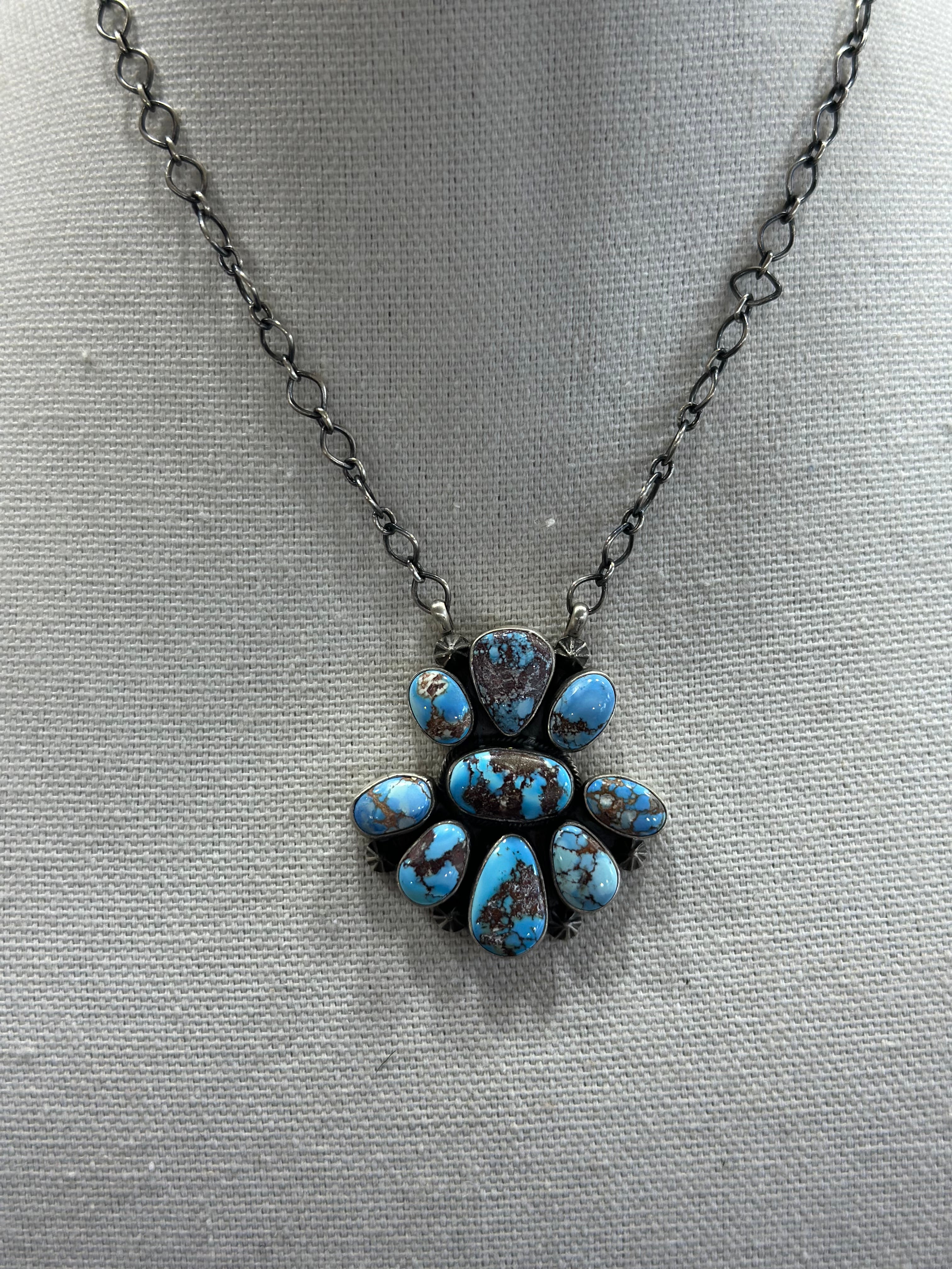 Soft, serene, and truly one of a kind — our Golden Hills Cluster Pendant showcases the rare beauty of Golden Hills turquoise in a radiant, handcrafted design. Featuring a carefully arranged cluster of natural stones in dreamy shades of pale blue to lavender, each accented by delicate golden or chestnut matrix, this pendant is a wearable work of art.