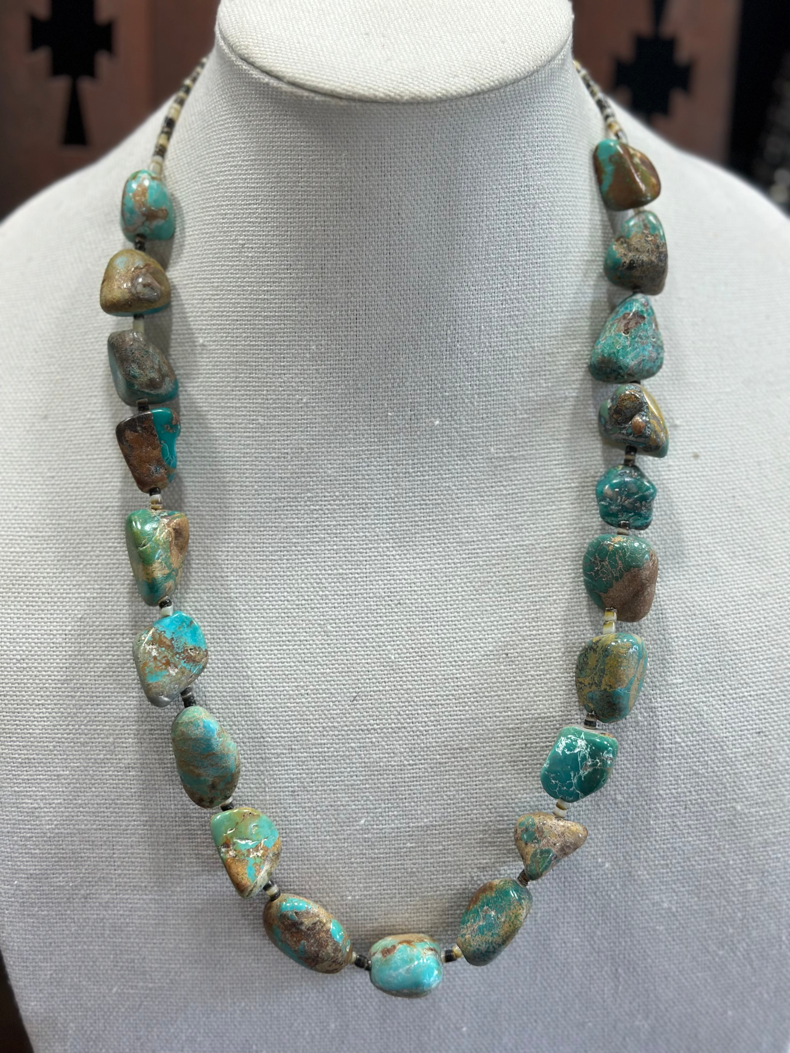 Make a statement with this stunning chunky Royston turquoise necklace, featuring rich shades of green and blue with striking golden-brown matrix. Each stone is hand-selected for its unique character, creating a one-of-a-kind piece full of earthy elegance. Whether you're dressing up or keeping it simple, this necklace adds a bold, soulful touch that pairs effortlessly with any look.