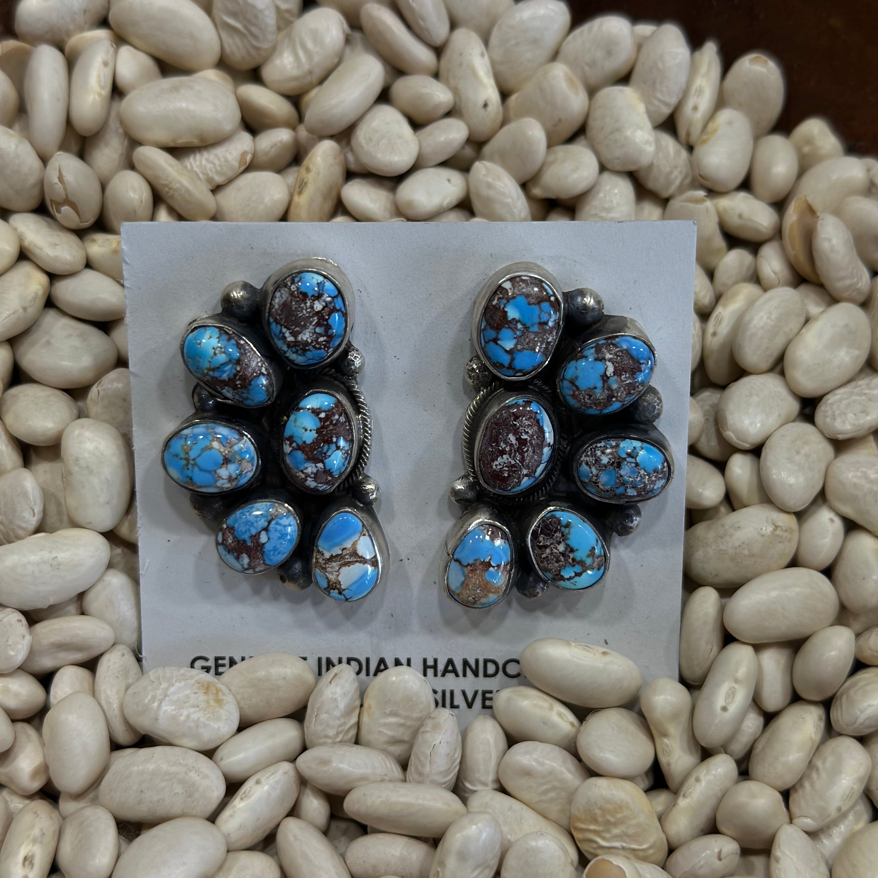 Soft, rare, and undeniably eye-catching — our Golden Hills Half Cluster Earrings showcase the unique beauty of genuine Golden Hills turquoise. Set in a graceful half-cluster design, each stone features dreamy shades of pale periwinkle blue with delicate golden or russet matrixing, making every pair truly one of a kind. These earrings bring a perfect balance of elegance, color, and artisan detail.