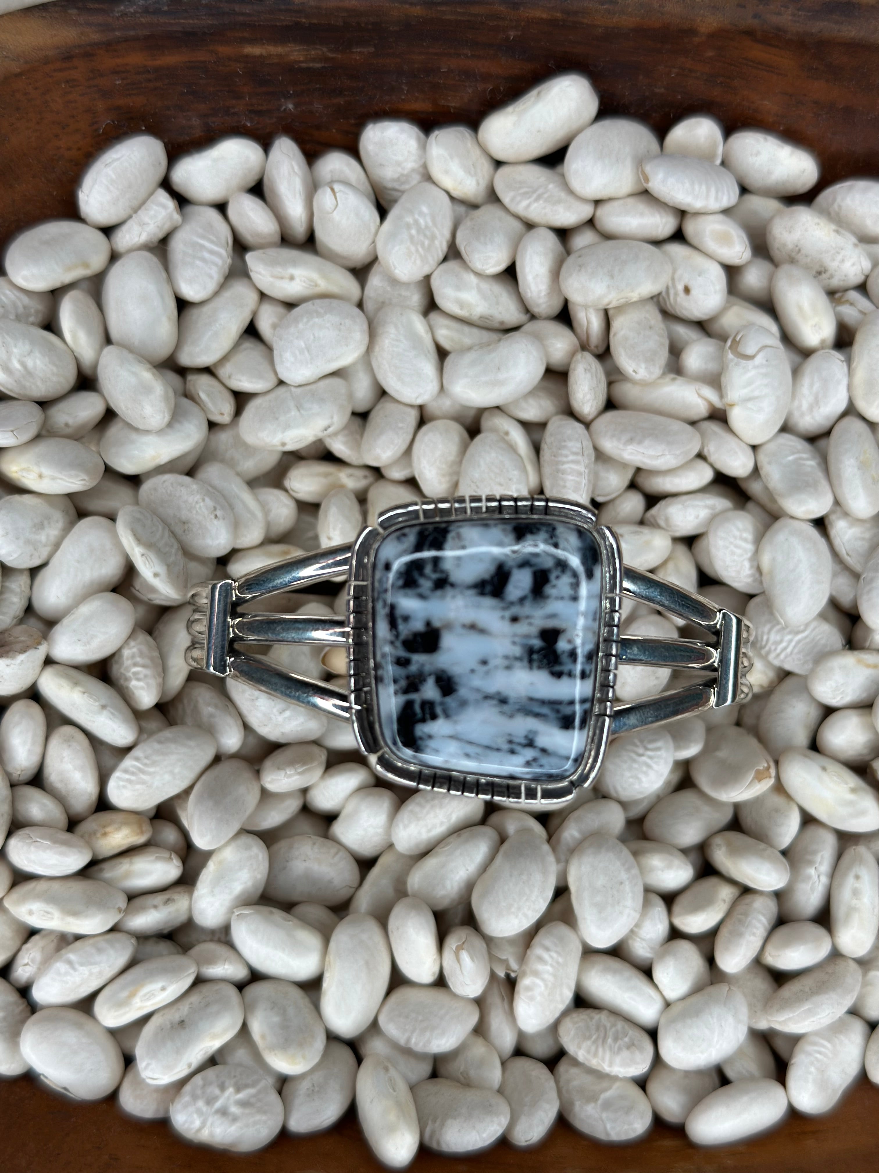 Make a powerful statement with our handcrafted White Buffalo Cuff, featuring a genuine white buffalo stone set in solid sterling silver. Known for its stunning contrast of creamy white and deep black matrix, each stone is one-of-a-kind—celebrated for its raw beauty, rarity, and deep spiritual meaning.