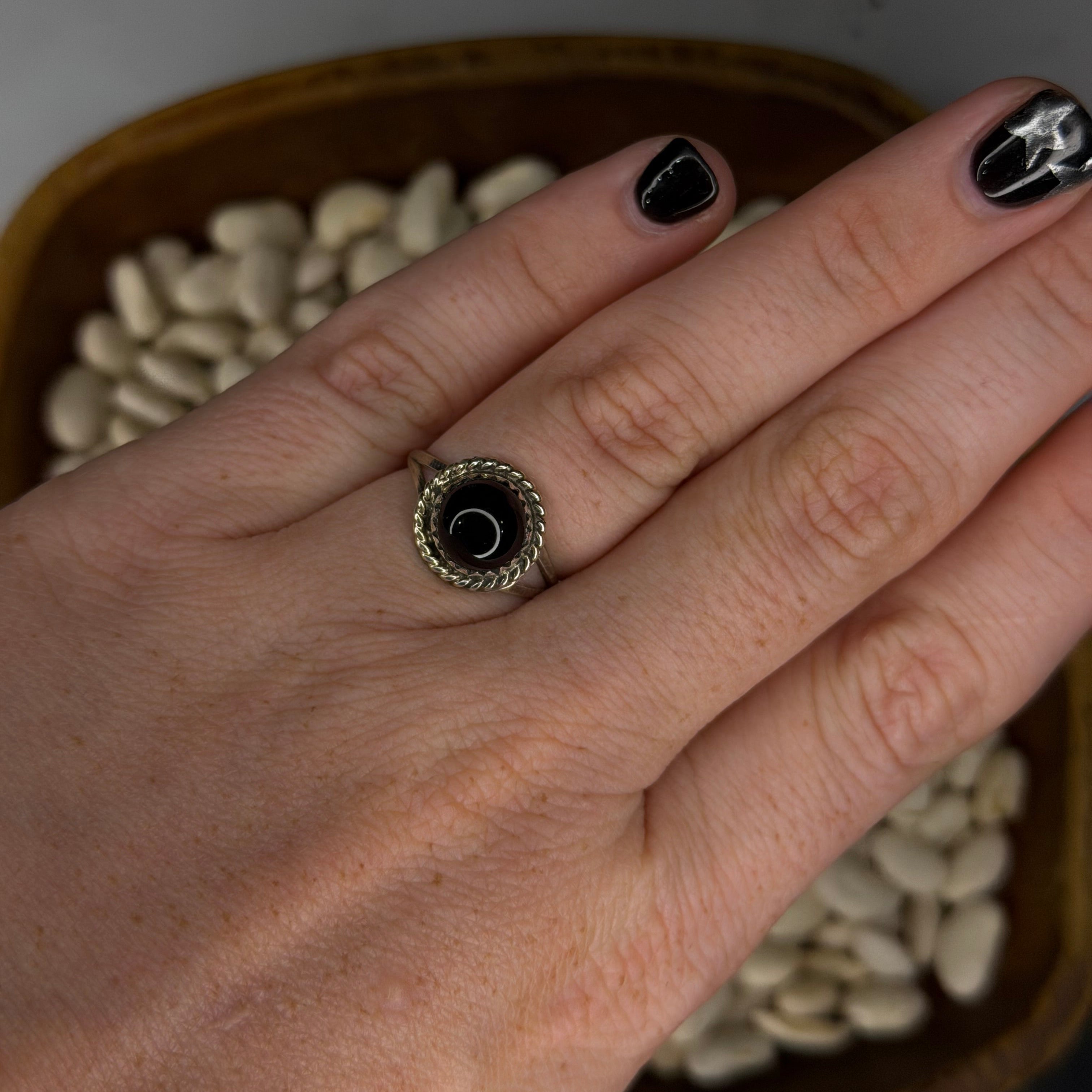 Striking in its simplicity, this black onyx ring is a bold statement of strength and clarity. Featuring a polished onyx stone set in a sleek sterling silver band, its clean design makes it a timeless piece for both everyday wear and special occasions. Known for its grounding and protective properties, onyx adds deeper meaning to this minimalist yet powerful accessory.