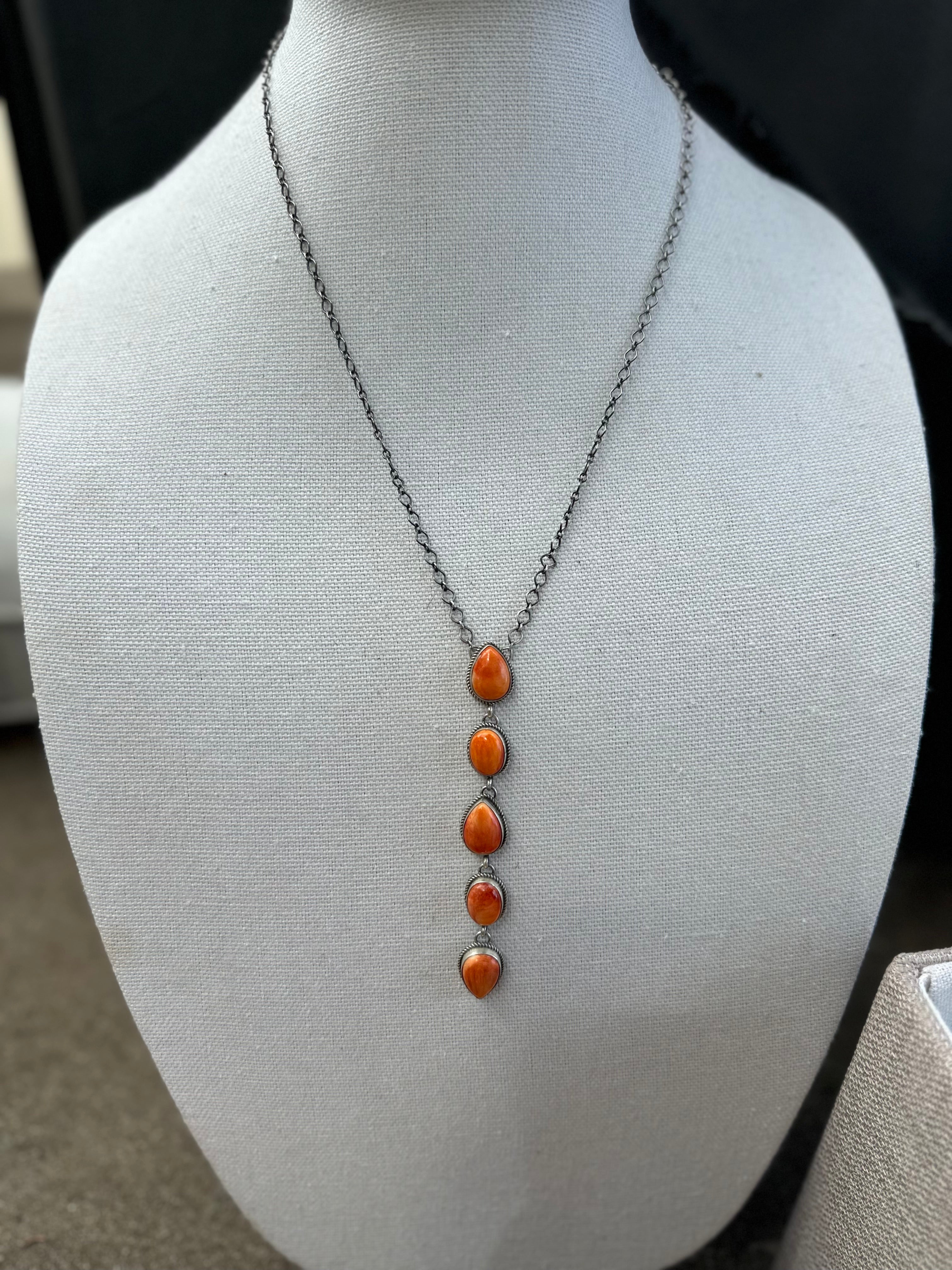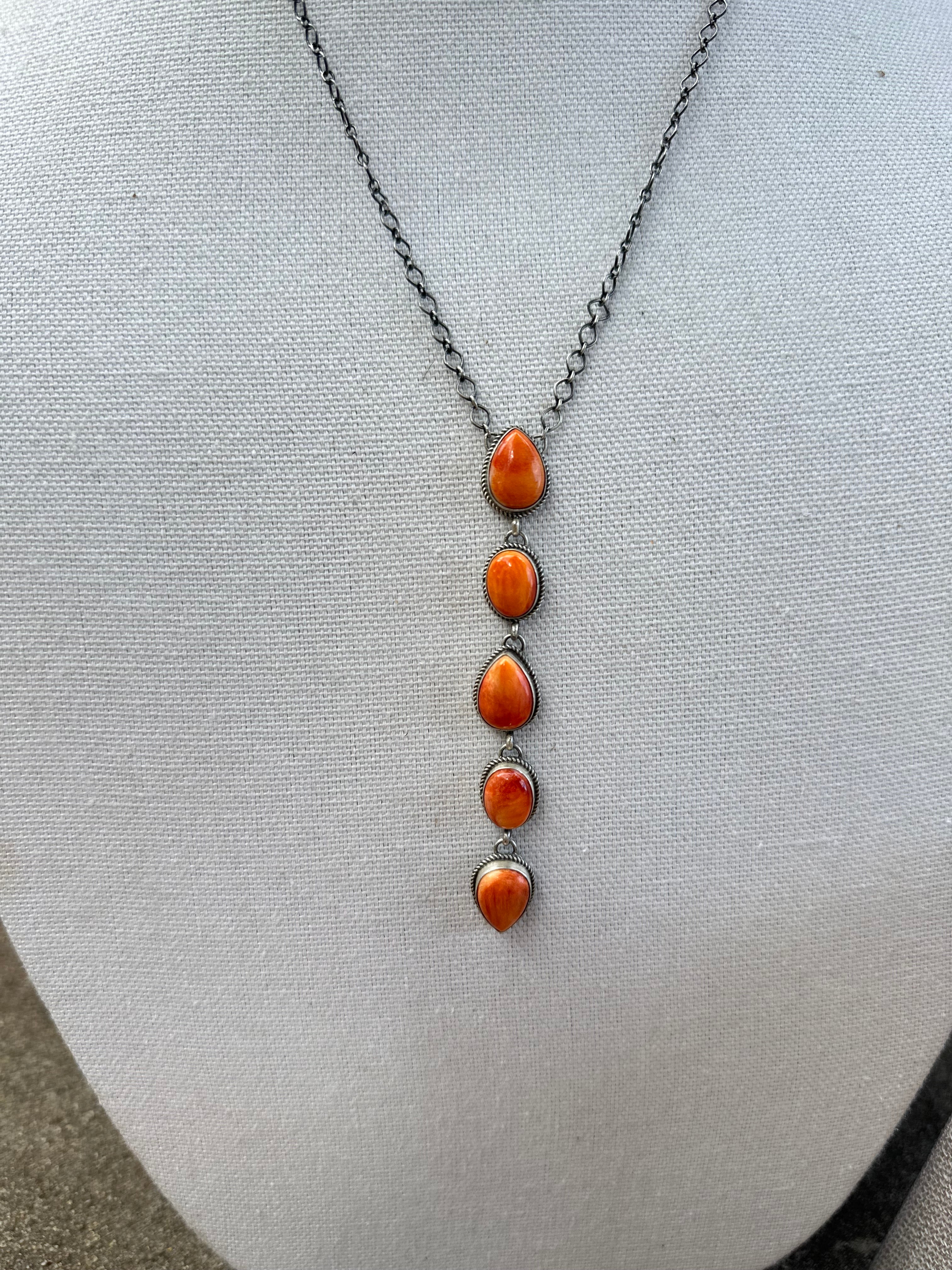 Bring warmth and movement to your look with this stunning orange spiny oyster multi-stone lariat necklace. Featuring a cascade of hand-selected stones in rich, fiery hues, each piece showcases the natural beauty and unique patterns of spiny oyster shell. The elegant lariat design creates a flattering silhouette, perfect for layering or wearing solo as a bold statement. Southwest-inspired with a modern twist, this necklace adds vibrant energy to any outfit.