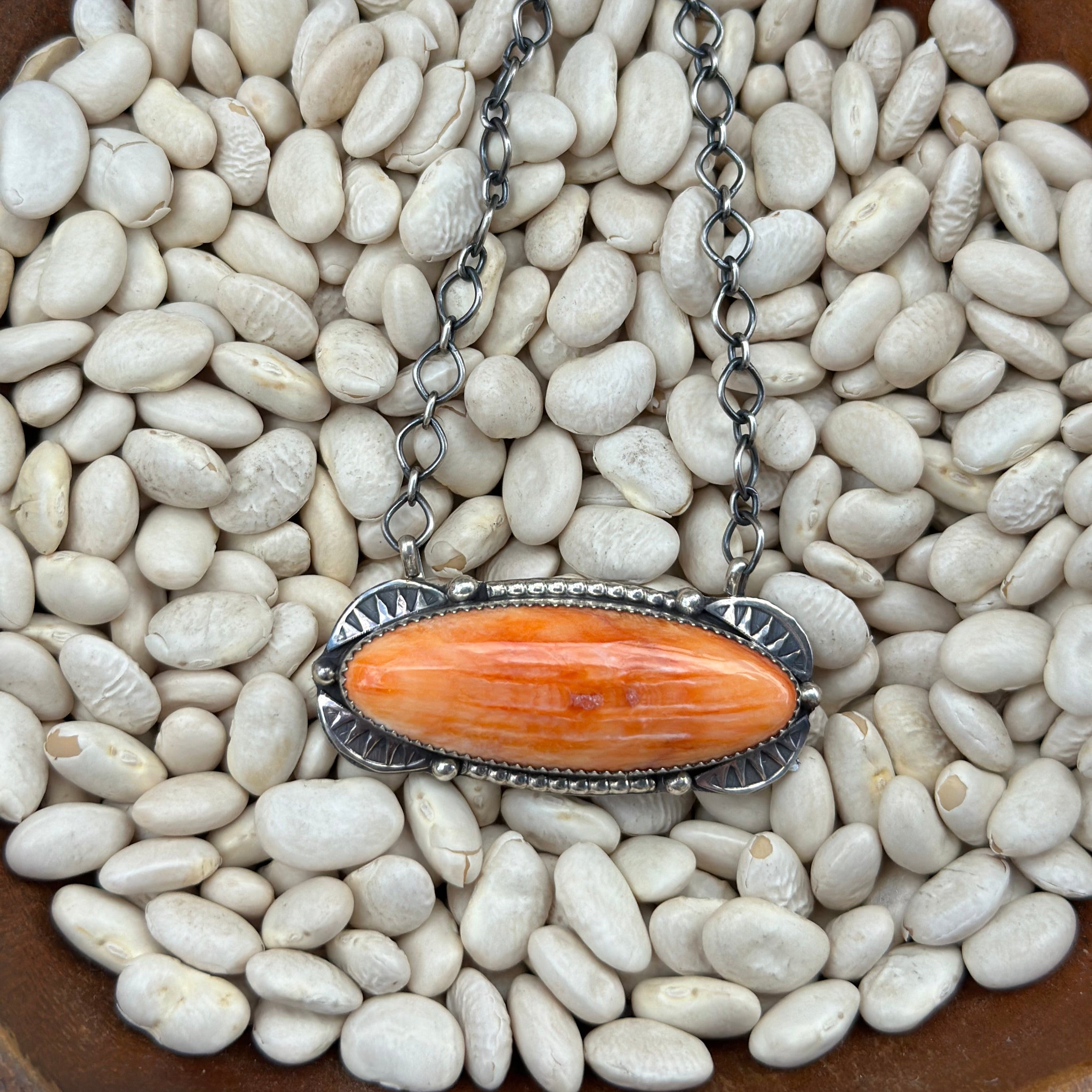Add a pop of sun-kissed color to your look with this gorgeous orange spiny oyster bar necklace. Featuring richly hued stones set in a sleek horizontal design, this piece captures the earthy warmth and natural beauty of the Southwest. Effortlessly stylish and easy to wear, it’s perfect for layering or standing on its own as a subtle statement. A must-have for anyone who loves bold color with timeless charm.