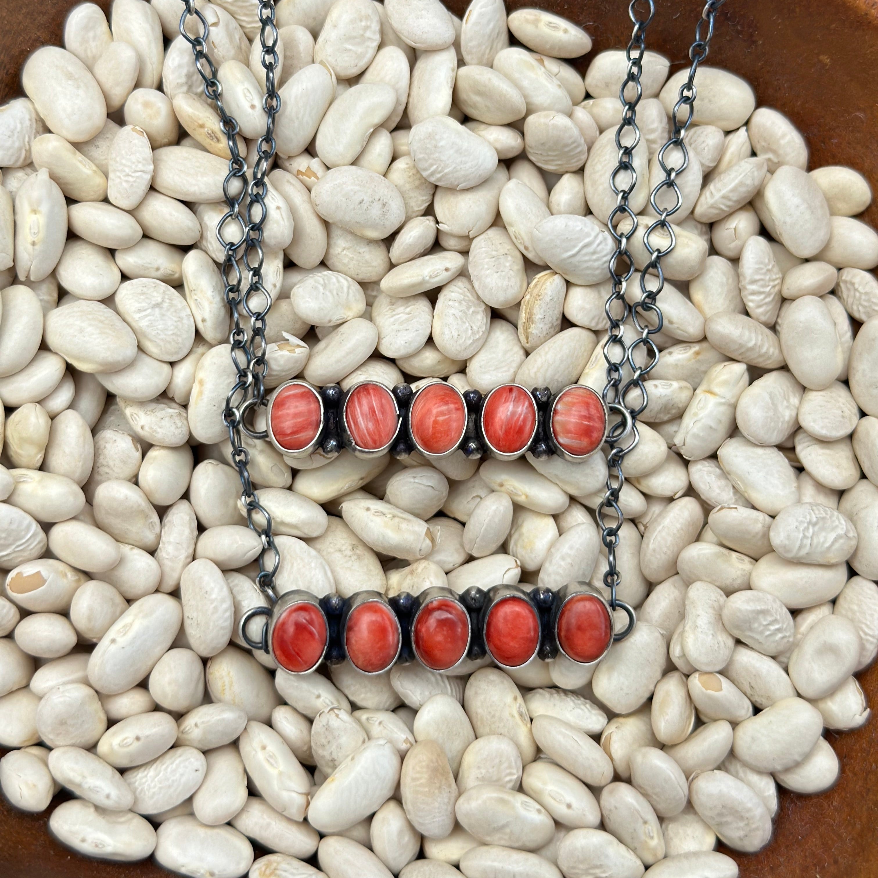 Rich, fiery, and full of character — this red spiny oyster multi-stone bar necklace brings natural beauty and bold energy to your everyday look. Featuring a row of hand-selected stones in deep red hues, each piece showcases unique patterns that make every necklace one of a kind. Set in a sleek horizontal bar, it’s perfect for layering or wearing solo as a standout statement. Southwest-inspired and effortlessly wearable.