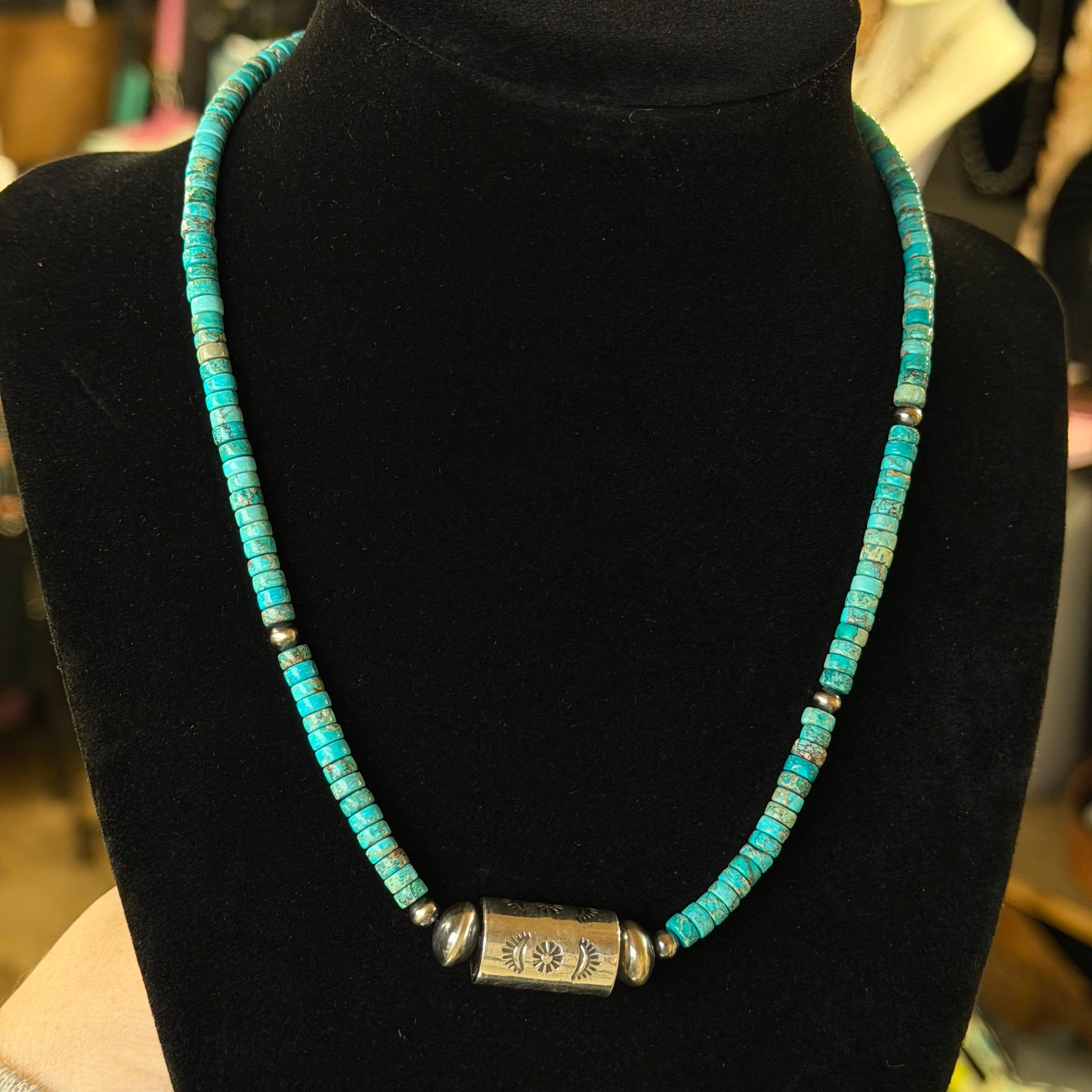 Turquoise Heishi & Sterling Barrel Bead Necklace