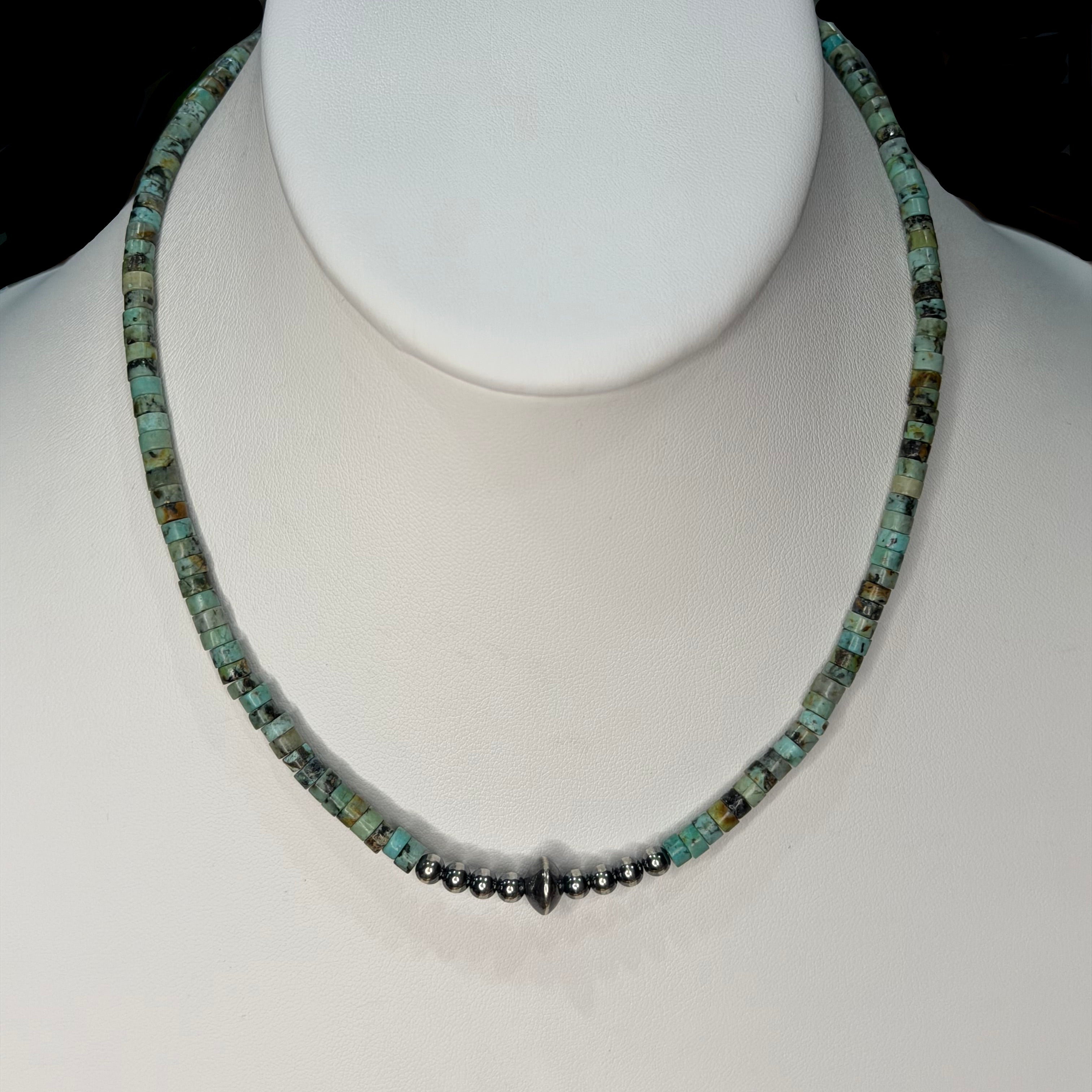 This African turquoise and sterling pearl necklace combines the vibrant, earthy blue-green tones of African turquoise with the soft, luminous glow of sterling pearls. The result is a stunning contrast of color and texture that feels both natural and refined.