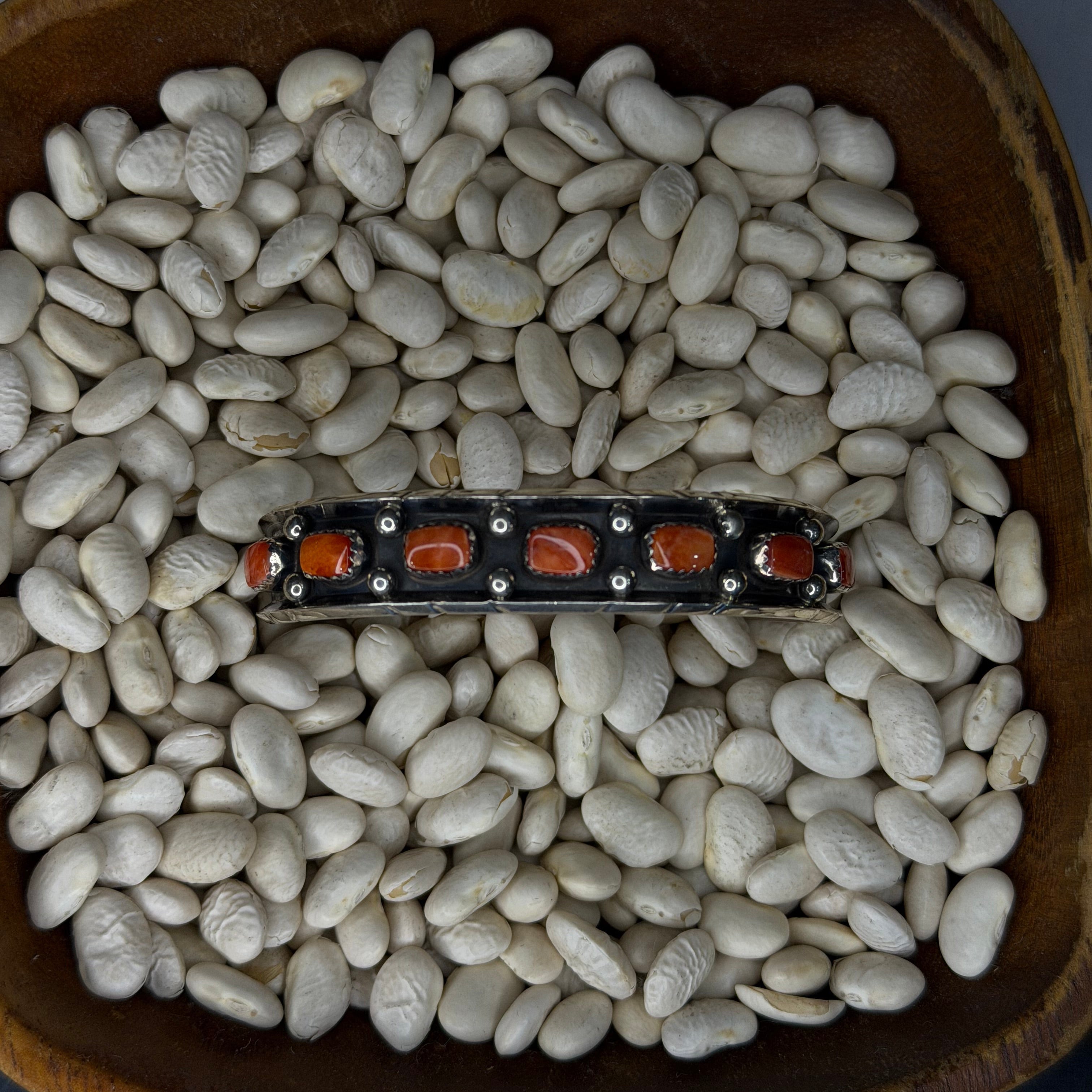 Celebrate color, culture, and craftsmanship with our Red Spiny Oyster Multi-Stone Cuff. This bold, handcrafted piece features vivid red spiny oyster shell set in a solid sterling silver cuff. Each stone is carefully selected for its unique pattern and rich color, creating a one-of-a-kind design that reflects the warmth of the earth and the soul of the Southwest.